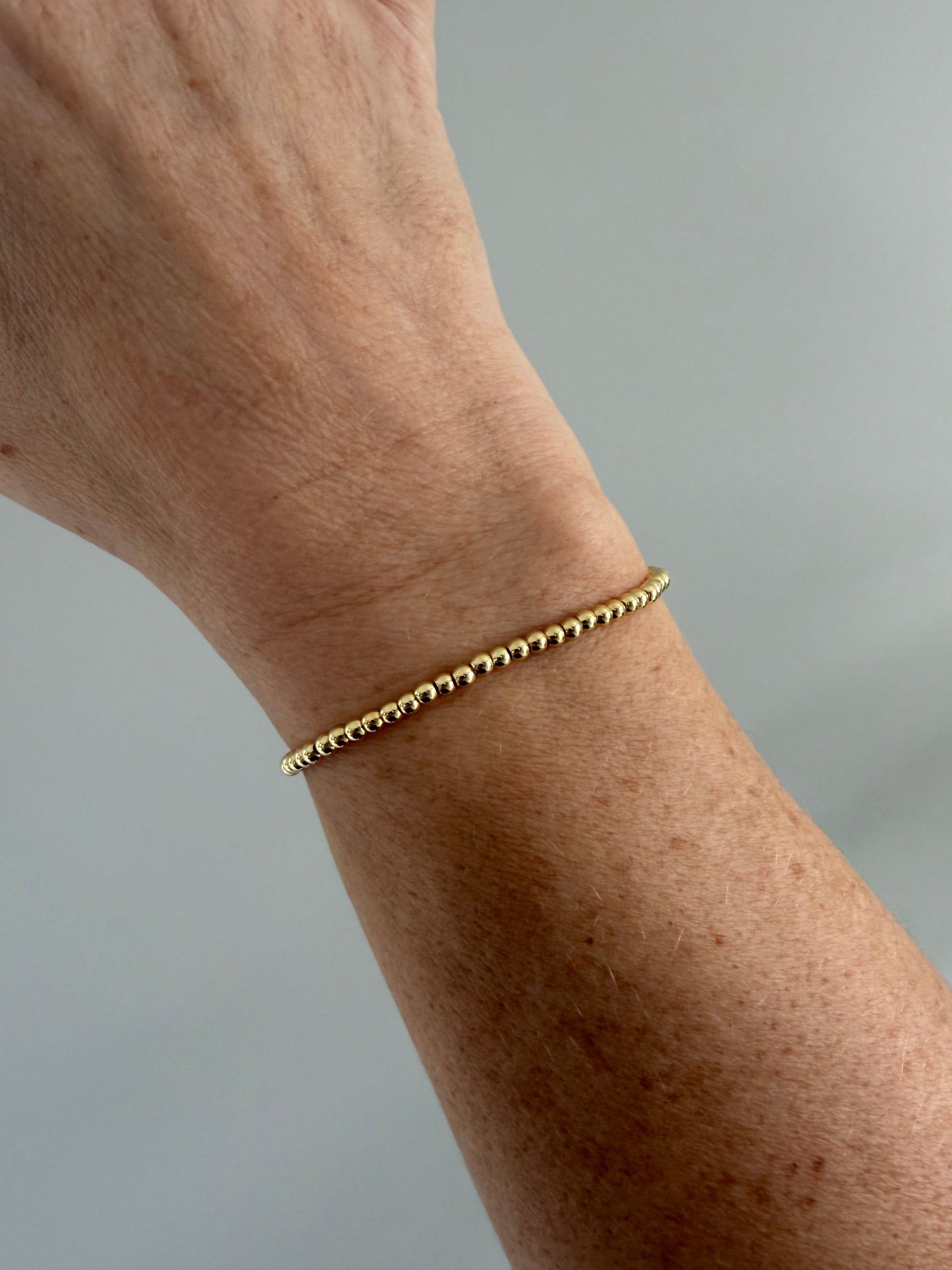 This handmade bracelet features polished 3mm beads crafted from high-quality 18k gold-filled material. Designed with a stretch fit for comfort and ease, it’s a lightweight, tarnish-resistant piece made for everyday wear.